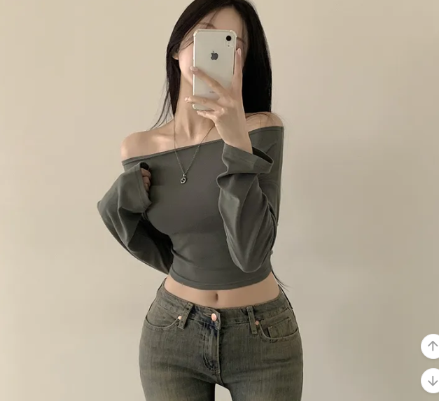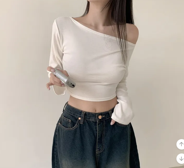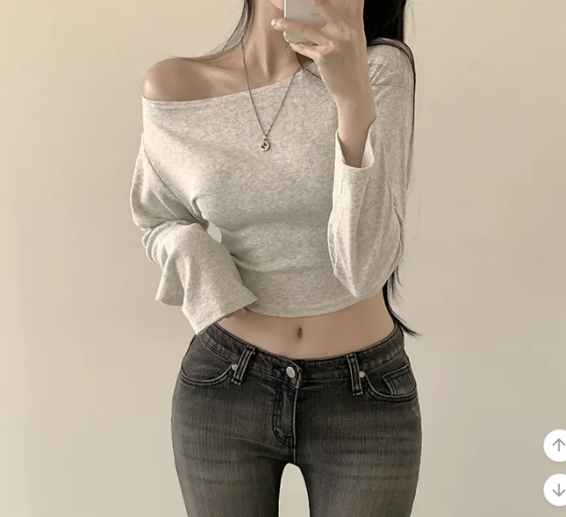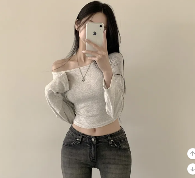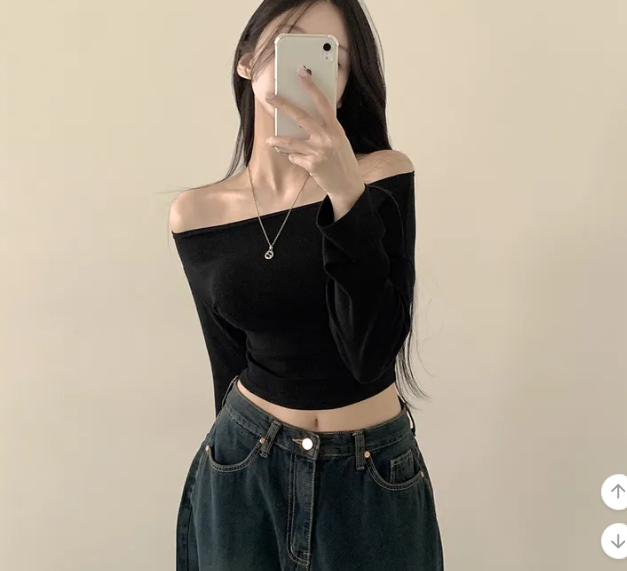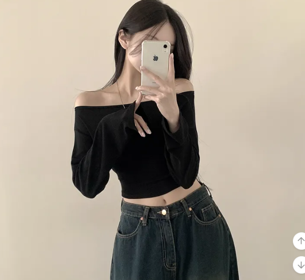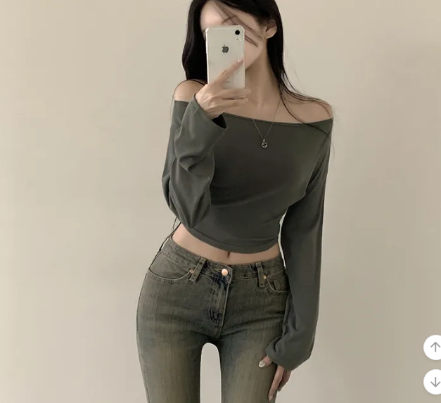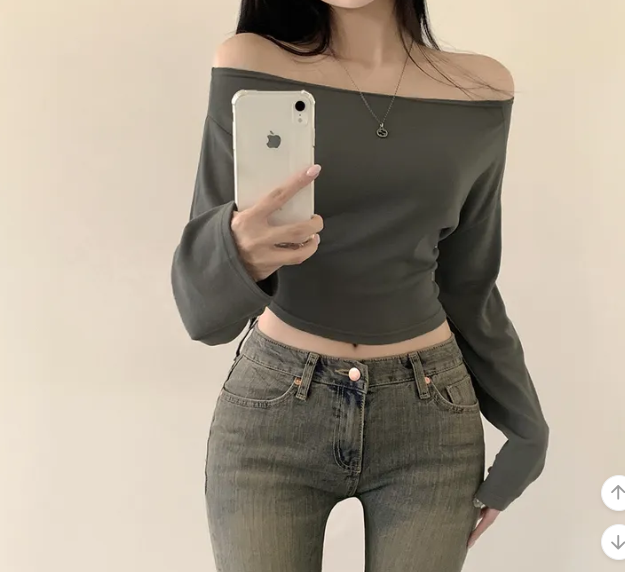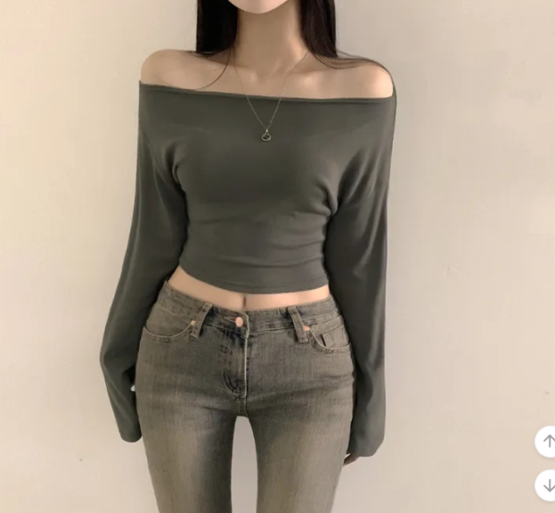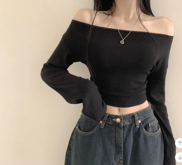 (•‾⌣‾•)露肩短款素色長袖衫💕富有彈性可以更顯瘦❤️