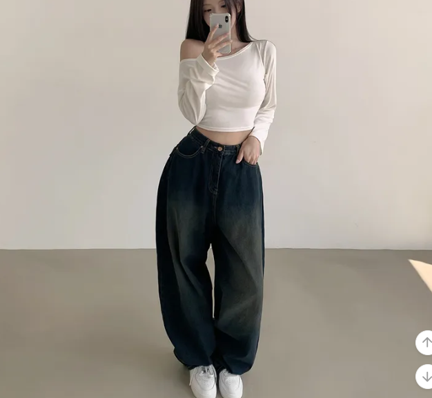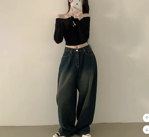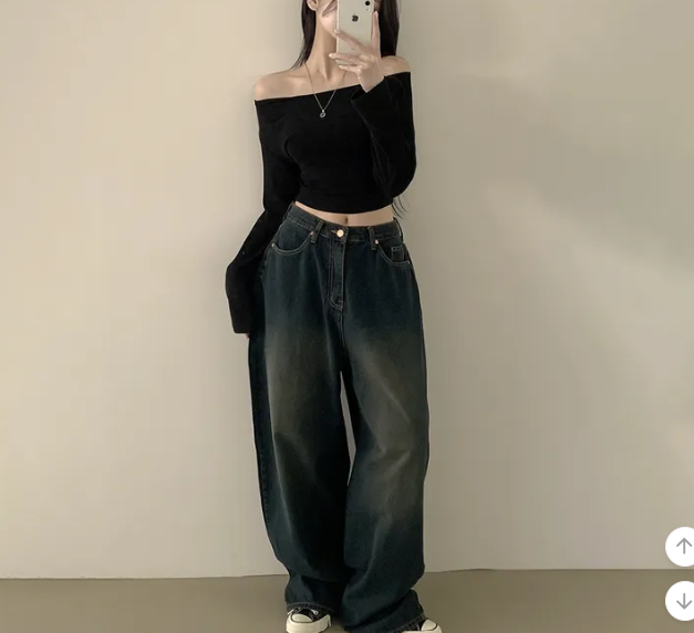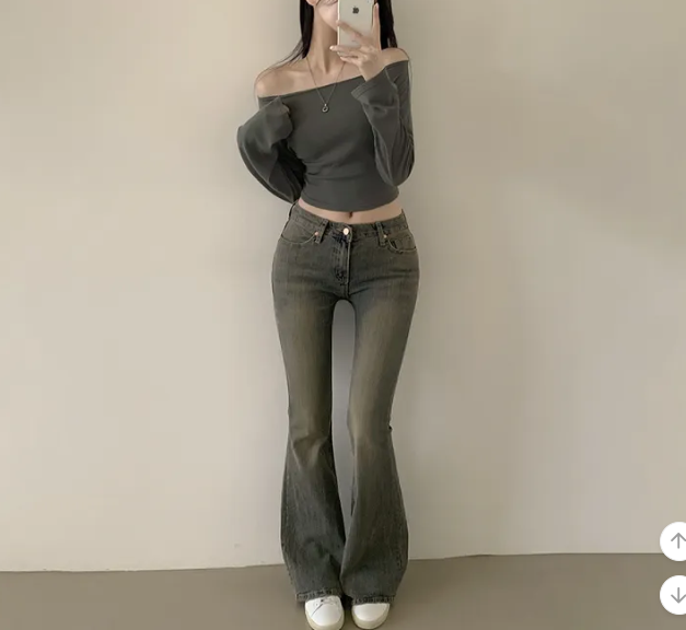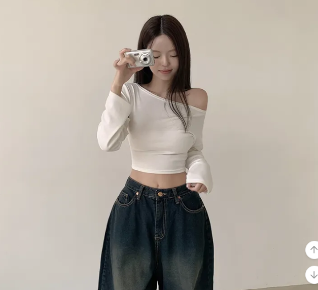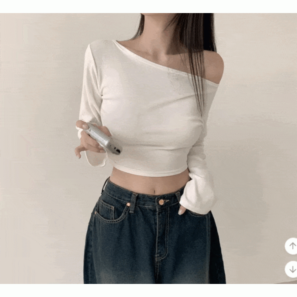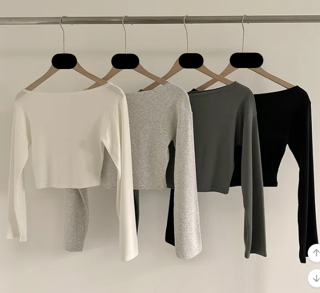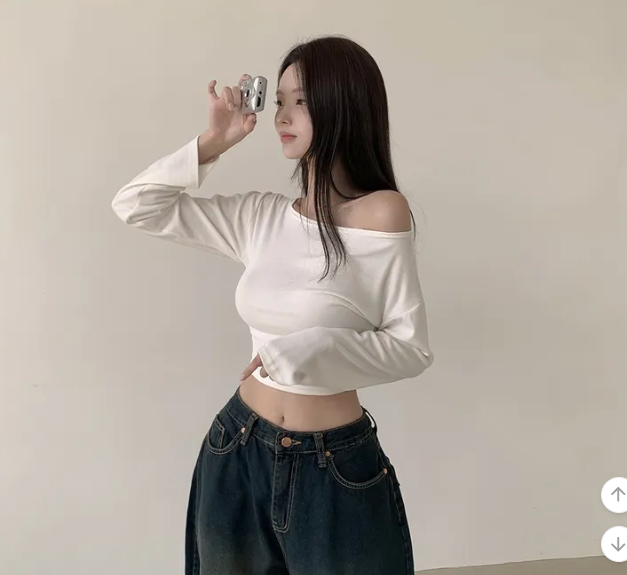 (•‾⌣‾•)露肩短款素色長袖衫💕富有彈性可以更顯瘦❤️