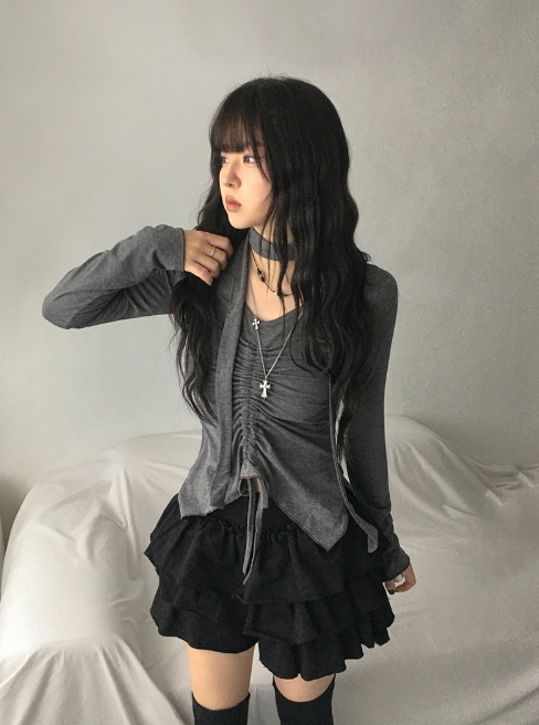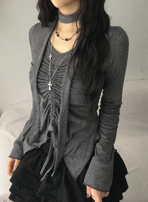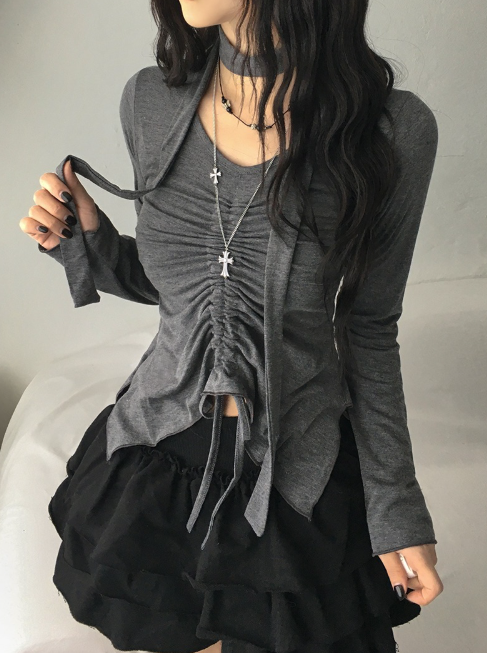 小圍巾復古不規則開衩長袖T恤【4色入】