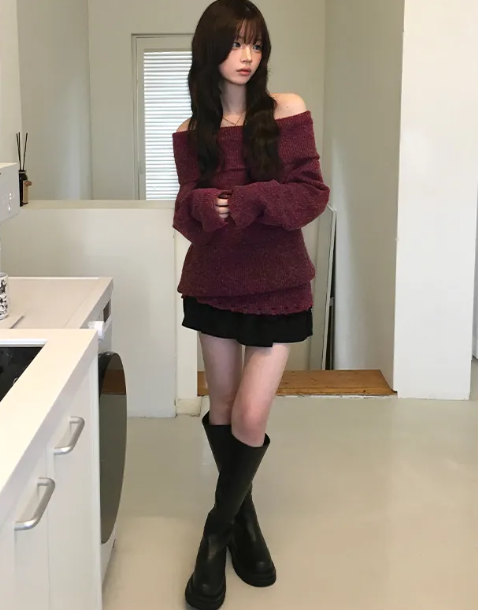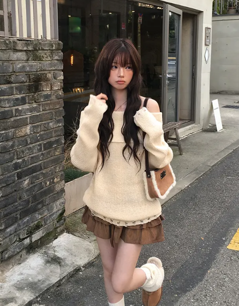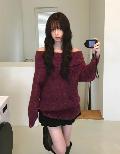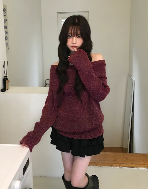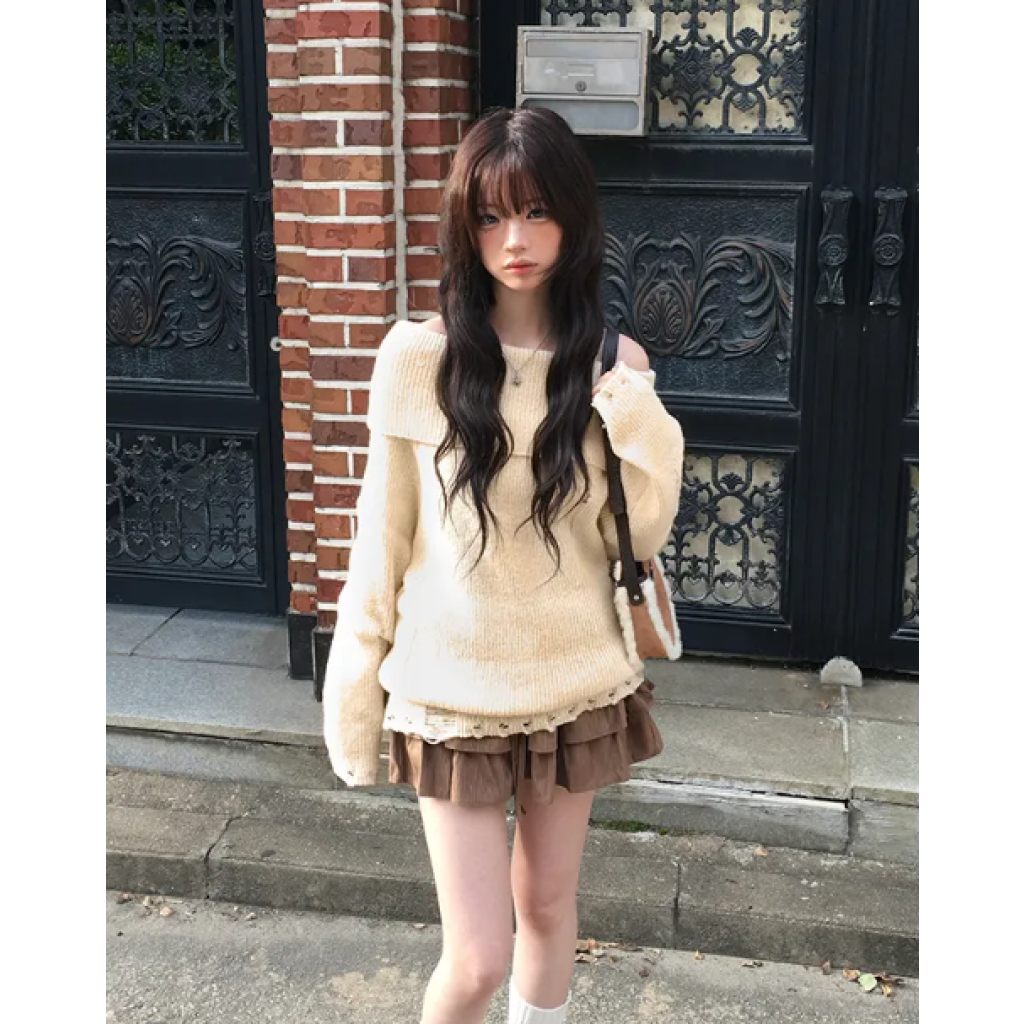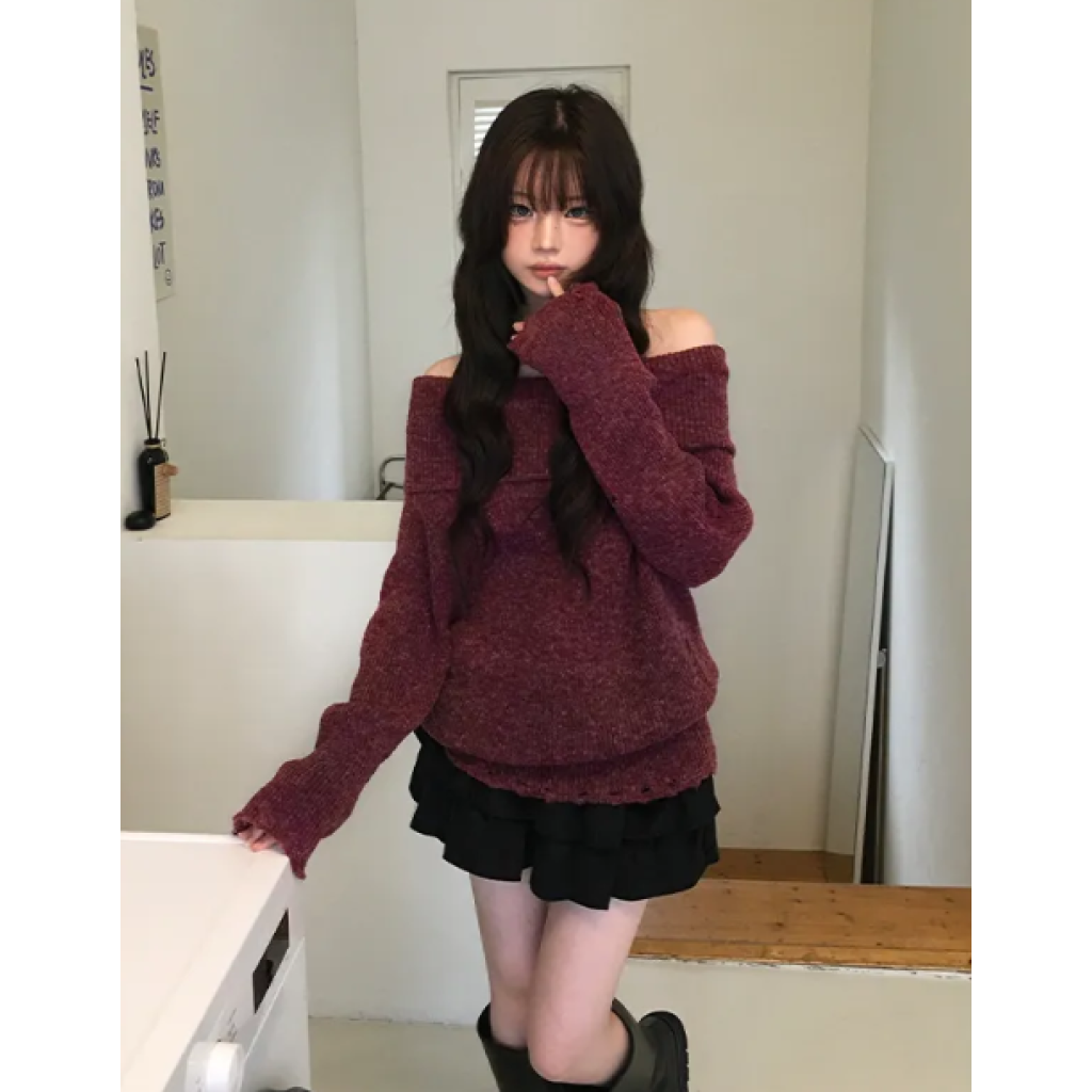 一字肩露肩破洞針織衫【4色入】