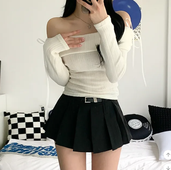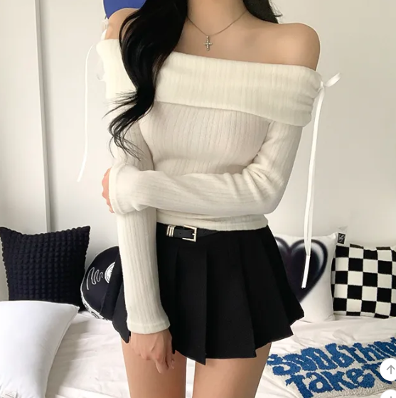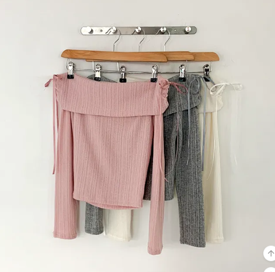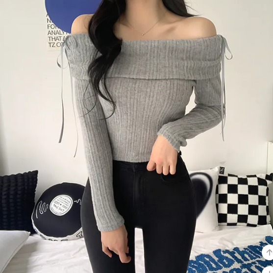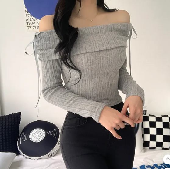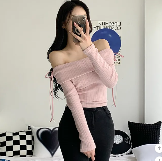 (•‾⌣‾•)簡約設計露肩上衣💕側邊有絲帶設計顯得好溫柔❤️